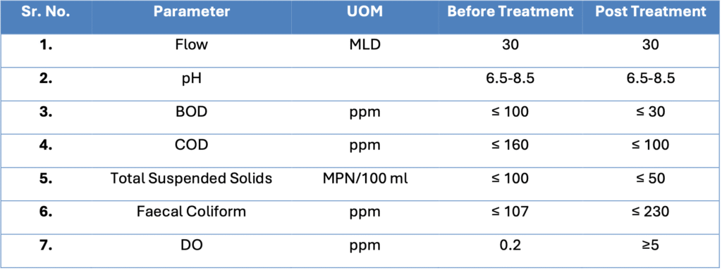 The project was successfully completed within the stipulated time, and the water quality of the Assi River improved significantly, helping to protect the health of the Ganga River. The innovative use of ozonated water and the efficient design allowed for significant contaminant reduction despite the space and accessibility constraints. The water quality parameters before and after treatment are mentioned below.
